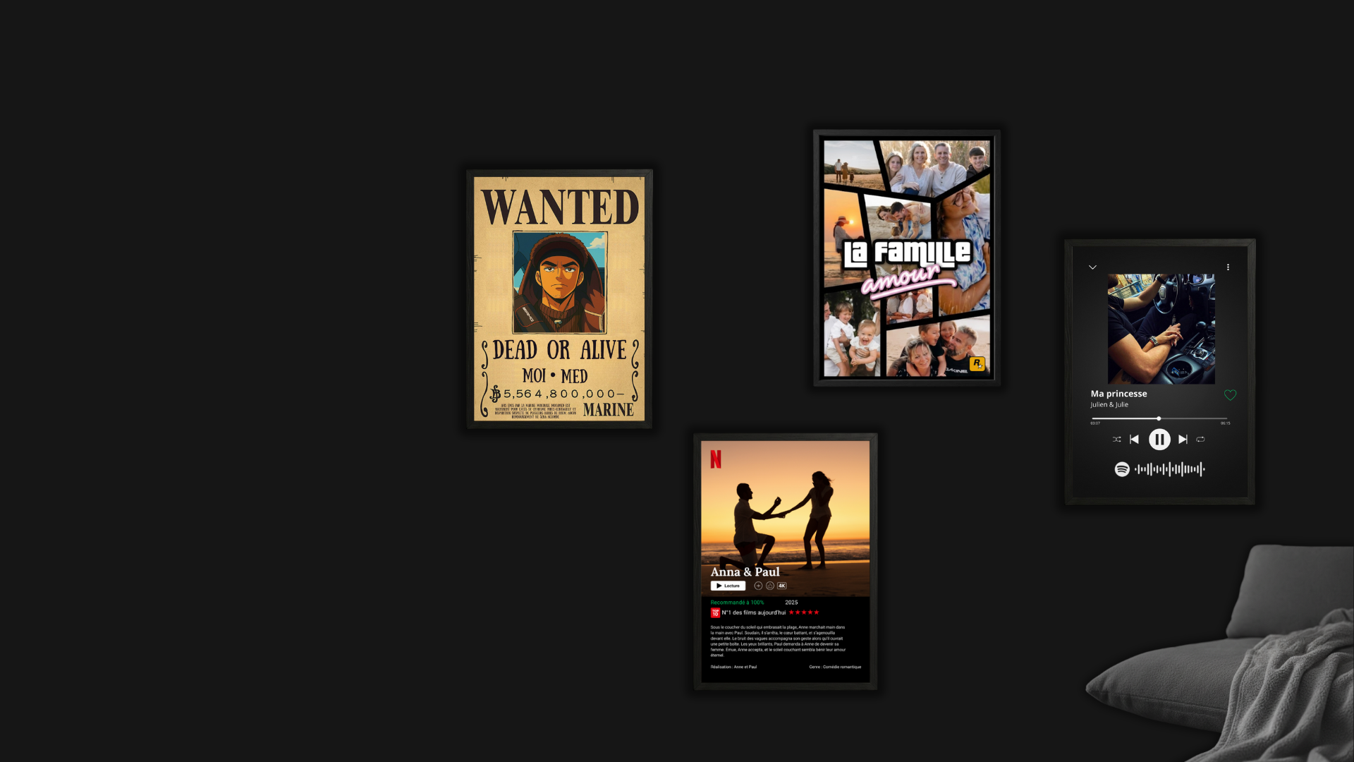 Créez votre cadre photo sur-mesure : importez vos images, textes et dates pour une décoration murale unique qui vous ressemble.